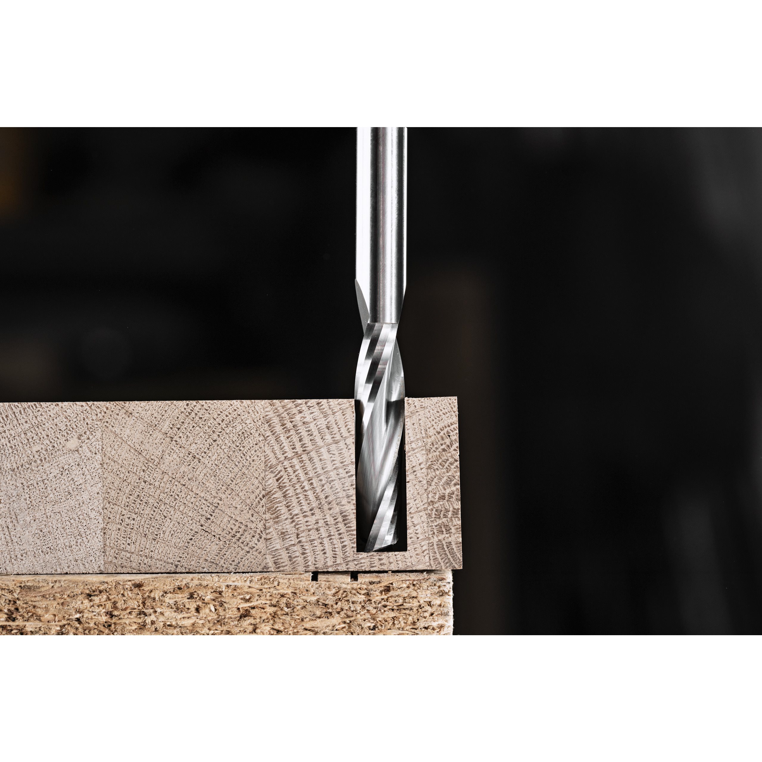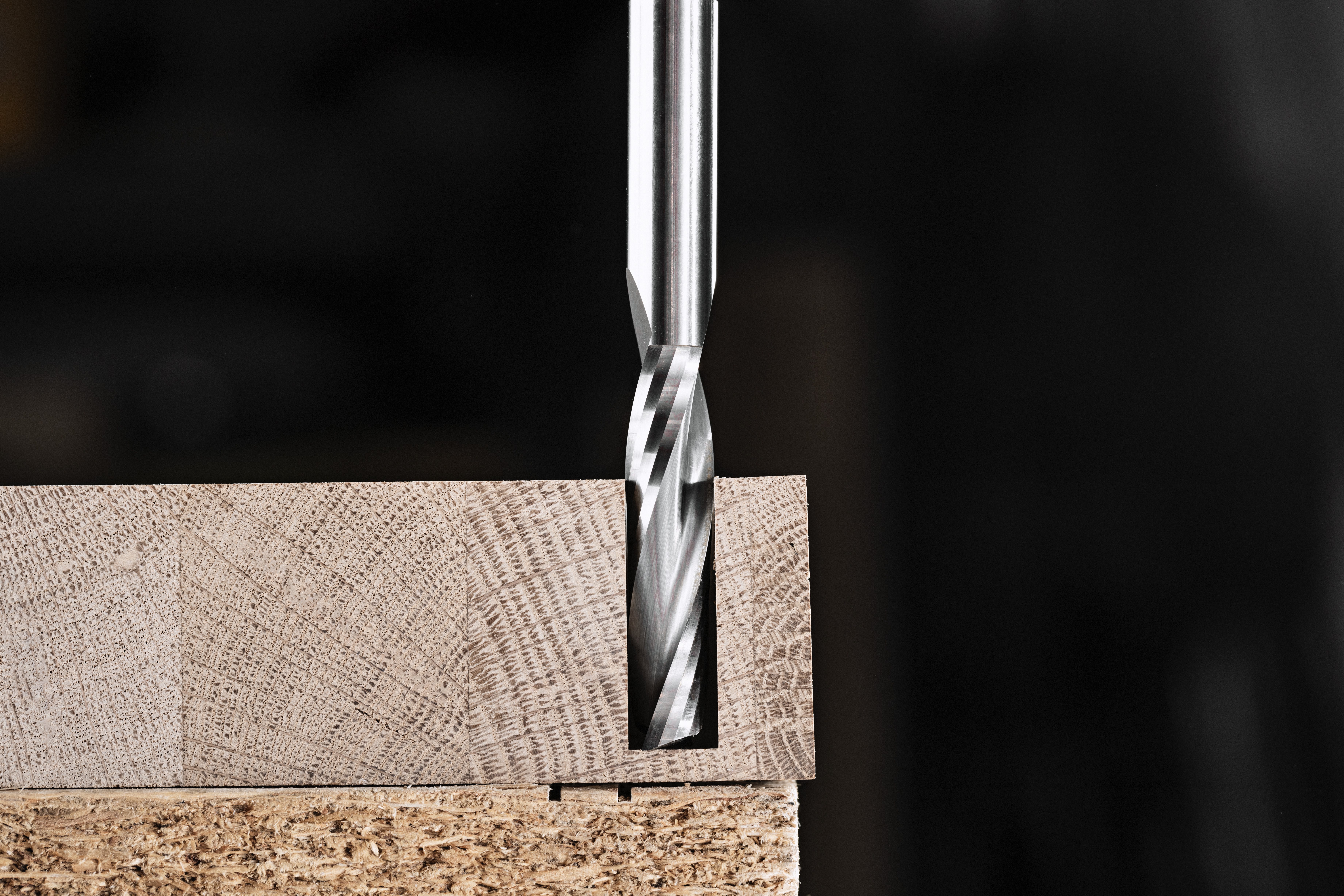 • Ein Spiralfräser mit positiven Spiralschneiden wirft die Späne nach oben aus und sorgt so für eine optimale Spanabfuhr, was zu höheren Vorschubgeschwindigkeiten ohne Verbrennungen und einer sauberen Oberfläche auf der Unterseite des Werkstücks führt.